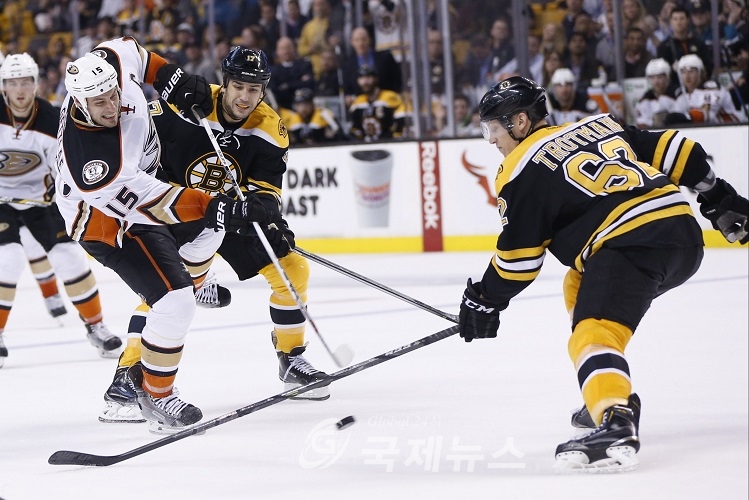 Mar 26, 2015; Boston, MA, USA; Anaheim Ducks center Ryan Getzlaf (15) scores the game winning goal while defended by Boston Bruins left wing Milan Lucic (17) and defenseman Zach Trotman (62) during the overtime period at TD Banknorth Garden. The Anaheim Ducks won 3-2 in overtime. Mandatory Credit: Greg M. Cooper-USA TODAY Sports