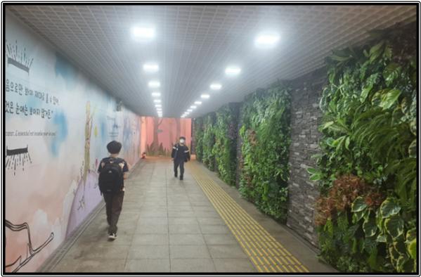 이번 지하보도의 정비를 통해 이용자들의 안전사고 예방을 위한 노후 시설의 개선과 더불어 실내조경 및 벽화 설치를 통한 내부 이미지 개선이 이루어졌다.