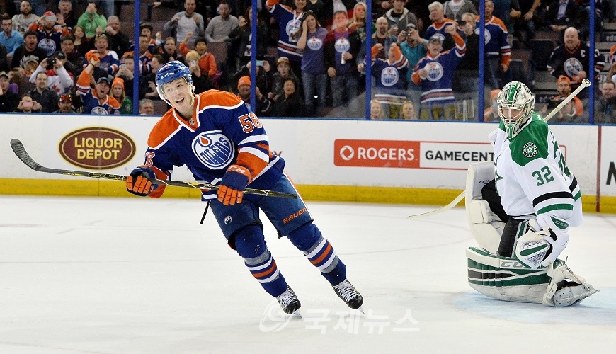 Mar 27, 2015; Edmonton, Alberta, CAN; Edmonton Oilers right winger Andrew Miller (58) is all smiles after scoring his first NHL goal against Dallas Stars goalie Kari Lehtonen (32) on a penalty shot in the third period at Rexall Place. Mandatory Credit: Chris LaFrance-USA TODAY Sports
