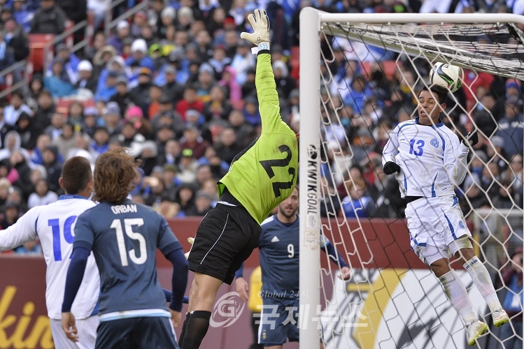 Mar 28, 2015; Landover, MD, USA; El Salvador midfielder Alexander Larin (13) attempts to save Argentina midfielder Federico Mancuello (not pictured) scoring strike during the second half at FedEx Field. Argentina defeated El Salvador 2-0. Mandatory Credit: Tommy Gilligan-USA TODAY Sports