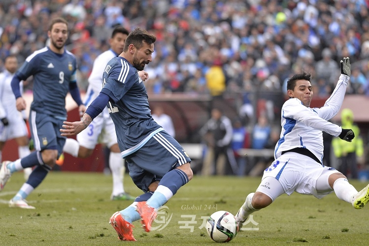 Mar 28, 2015; Landover, MD, USA; Argentina forward Ezequiel Lavezzi (22) shoots as El Salvador midfielder Alexander Larin (13) attempts to block the shot during the second half at FedEx Field. Argentina defeated El Salvador 2-0. Mandatory Credit: Tommy Gilligan-USA TODAY Sports