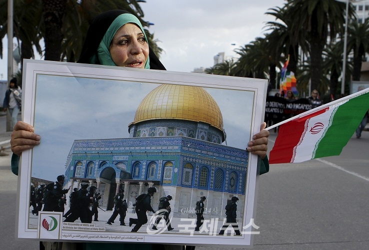 An Iranian woman participant at the World Social Forum holds a poster and the Iranian flag during a march at the end of the 2015 World Social Forum (WSF) in solidarity with Palestinians in Tunis March 28, 2015. REUTERS/Anis Mili