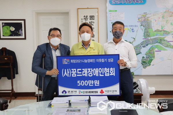 (군산=국제뉴스) 조판철 기자 = (사)꿈드래장애인협회(회장 하태복)에서 13일 “회원들의 참뜻과 정성을 모아 희망 나눔 실천에 동참할 수 있어서 뜻깊게 생각하고 앞으로도 각종 봉사활동을 통해서 회원들과 더불어 사는 사회를 만드는데 노력하겠다” 며 성금 500만원을 군산시에 기탁했다.