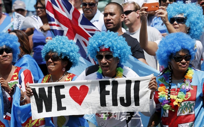 Fans supporting Fiji wear wigs at their team's match against England on the final day of the Hong Kong Sevens rugby tournament at Hong Kong Stadium in Hong Kong March 29, 2015. REUTERS/Bobby Yip