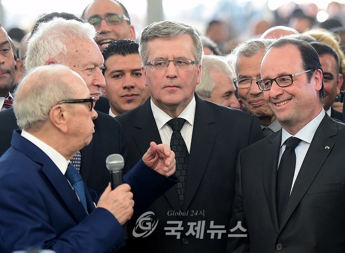 Spain's Foreign Minister Jose Manuel Garcia-Margallo (L), Poland's President Bronislaw Komorowski (C) and France's President Francois Hollande (R) listen to a speech by Tunisia's President Beji Caid Essebsi following a musical hommage in Tunis, on March 29, 2015 in honour of the victims of the massacre of foreign tourists at the country's national museum. REUTERS/Emmanuel Dunand/Pool