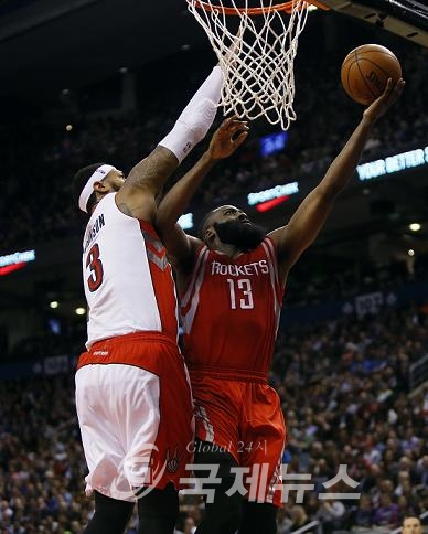 Mar 30, 2015; Toronto, Ontario, CAN; Houston Rockets guard James Harden (13) goes up to make a basket as Toronto Raptors forwardJames Johnson (3) defends at the Air Canada Centre. Toronto defeated Houston 99-96. Mandatory Credit: John E. Sokolowski-USA TODAY Sports