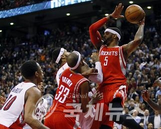 Mar 30, 2015; Toronto, Ontario, CAN; Houston Rockets forward Josh Smith (5) goes to pass the ball as Toronto Raptors guard DeMar DeRozan (10) and forward James Johnson (3) defend as Houston Rockets guard Corey Brewer (33) helps out at the Air Canada Centre.Toronto defeated Houston 99-96. Mandatory Credit: John E. Sokolowski-USA TODAY Sports