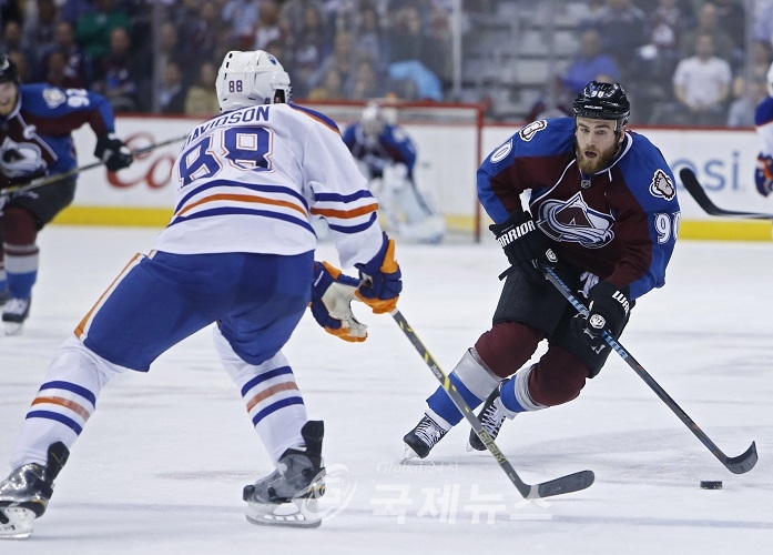 Mar 30, 2015; Denver, CO, USA; Colorado Avalanche center Ryan O'Reilly (90) brings the puck up the ice against Edmonton Oilers defenseman Brandon Davidson (88) during the second period at Pepsi Center. Mandatory Credit: Chris Humphreys-USA TODAY Sports