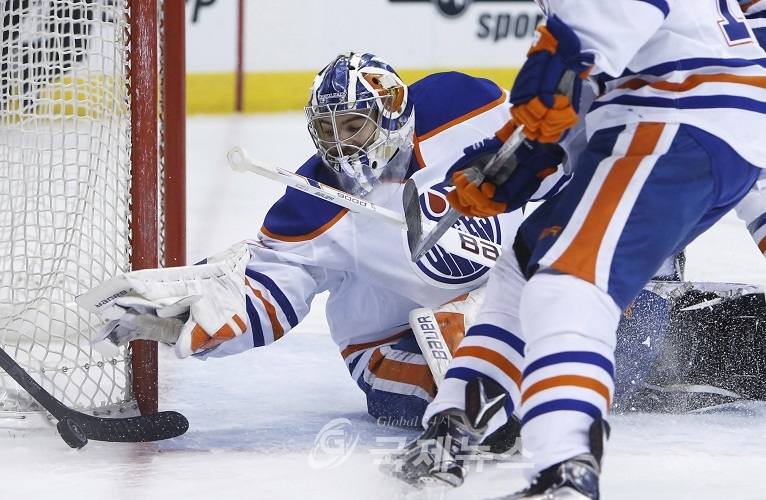 Mar 30, 2015; Denver, CO, USA; Edmonton Oilers goalie Richard Bachman (32) reaches for the puck by the goal during the second period against the Colorado Avalanche at Pepsi Center. Mandatory Credit: Chris Humphreys-USA TODAY Sports