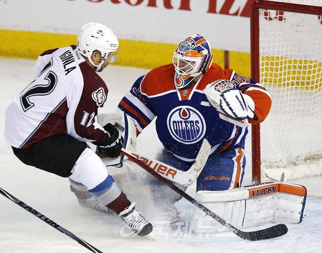 Mar 25, 2015; Edmonton, Alberta, CAN; Edmonton Oilers goaltender Ben Scrivens (30) stops Colorado Avalanche forward Jerome Iginla (12) during the first period at Rexall Place. Mandatory Credit: Perry Nelson-USA TODAY Sports