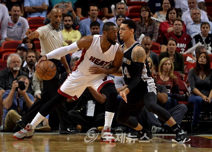 Mar 31, 2015; Miami, FL, USA; Miami Heat guard Dwyane Wade (3) is pressured by San Antonio Spurs guard Danny Green (14) during the second half at American Airlines Arena. Mandatory Credit: Steve Mitchell-USA TODAY Sports