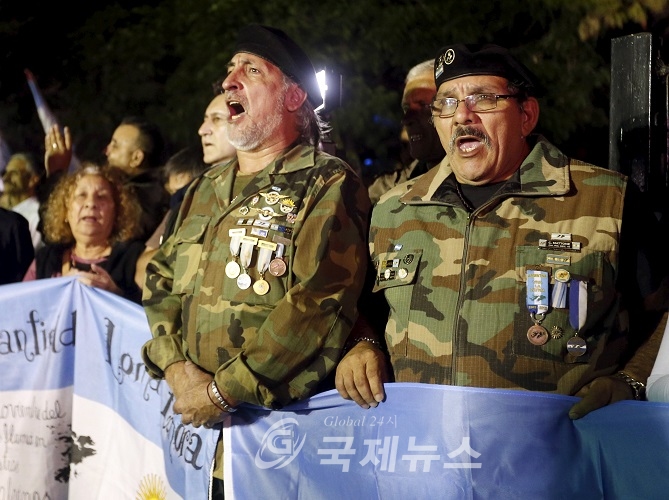 Veterans of the 1982 Falklands War pay tribute to Argentine servicemen who died in the South Atlantic conflict between Britain andArgentina on the 33rd anniversary of the war over the island chain in Buenos Aires April 2, 2015. Argentina's government claims the islands, which lie 300 miles (480 km) off the Argentine coast and 8,000 miles (12,870 km) from Britain, as its own. It has stepped up a campaign to get sovereignty over the islands, which Argentines call Las Malvinas, as nearby oil and gas exploration ratchets up tensions. About 2,800 people live on the islands, where the main industries are sheep farming, fishing and some tourism. REUTERS/Enrique Marcarian