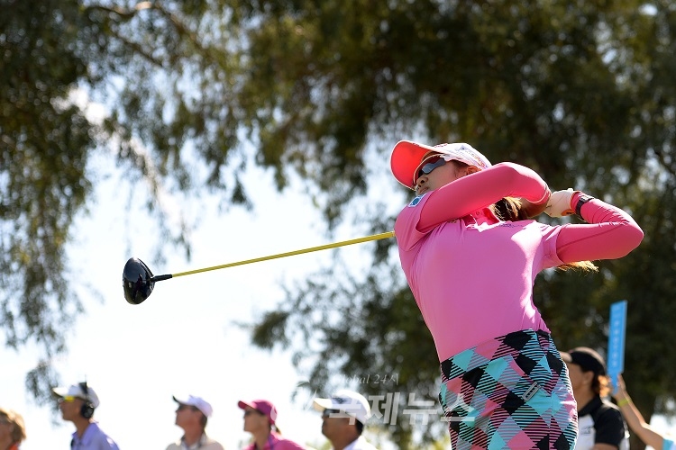 Apr 3, 2015; Rancho Mirage, CA, USA; Pornonong Phatlum tees off on the 18th during the second round of the ANA Inspiration at Mission Hills CC - Dinah Shore Tournament Course. Mandatory Credit: Jake Roth-USA TODAY Sports