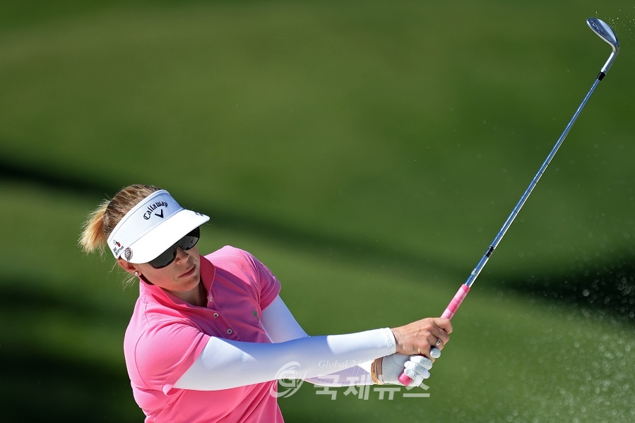 Apr 3, 2015; Rancho Mirage, CA, USA; Morgan Pressel plays out of a greenside bunker on the 17th during the second round of the ANA Inspiration at Mission Hills CC - Dinah Shore Tournament Course. Mandatory Credit: Jake Roth-USA TODAY Sports