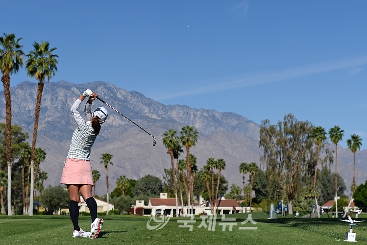 Apr 3, 2015; Rancho Mirage, CA, USA; Ai Miyazato tees off on the fifth hole during the second round of the ANA Inspiration at Mission Hills CC - Dinah Shore Tournament Course. Mandatory Credit: Jake Roth-USA TODAY Sports