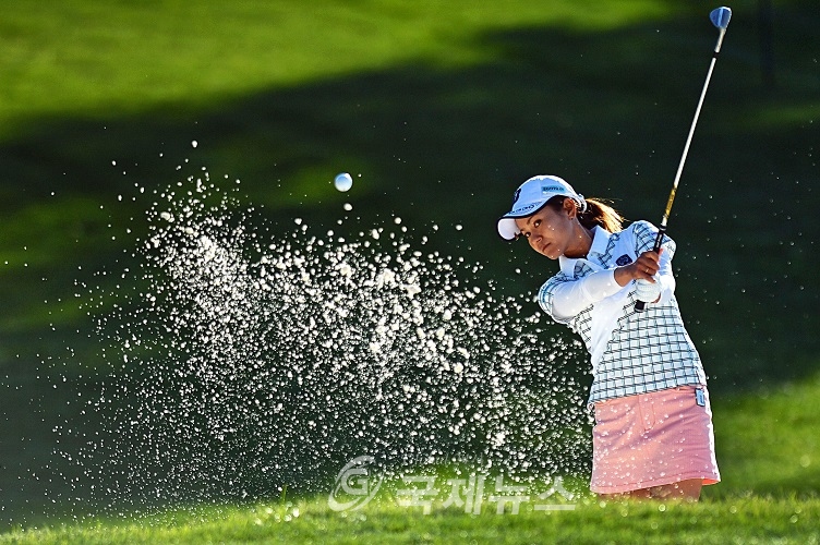Apr 3, 2015; Rancho Mirage, CA, USA; Ai Miyazato plays out of a greenside bunker on the first hole during the second round of the ANA Inspiration at Mission Hills CC - Dinah Shore Tournament Course. Mandatory Credit: Jake Roth-USA TODAY Sports