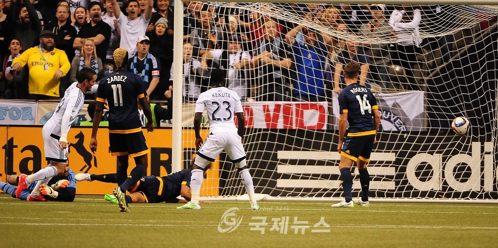 Apr 4, 2015; Vancouver, British Columbia, CAN; Vancouver Whitecaps forward Octavio Rivero (29) scores against LA Galaxy goalkeeper Jaime Penedo (18) during the second half at BC Place. The Vancouver Whitecaps won 2-0. Mandatory Credit: Anne-Marie Sorvin-USA TODAY Sports