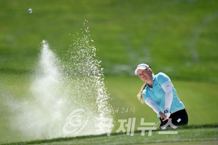Apr 5, 2015; Rancho Mirage, CA, USA; Brittany Lincicome plays a shot out of a greenside bunker on the eighth hole during the final round of the ANA Inspiration at Mission Hills CC - Dinah Shore Tournament Course. Mandatory Credit: Jake Roth-USA TODAY Sports