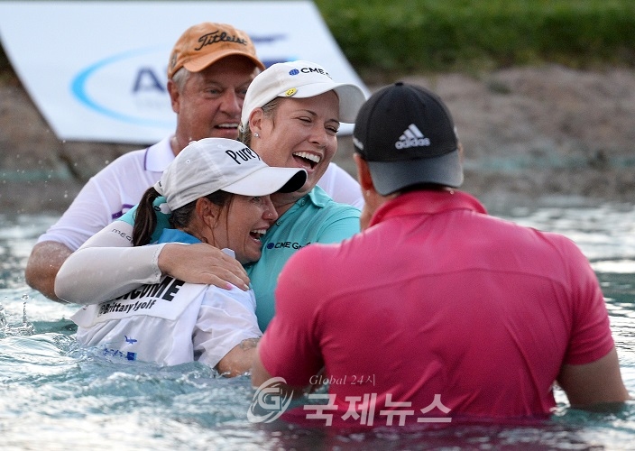 Apr 5, 2015; Rancho Mirage, CA, USA; Brittany Lincicome (middle right) hugs her caddie Missy Pederson after taking the leap into the pond with her father Tom Lincicome (background) and fiance' Dewald Gouws (foreground), and caddie Missy Pederson (left) after winning the ANA Inspiration at Mission Hills CC - Dinah Shore Tournament Course in a three hole playoff. Mandatory Credit: Jake Roth-USA TODAY Sports