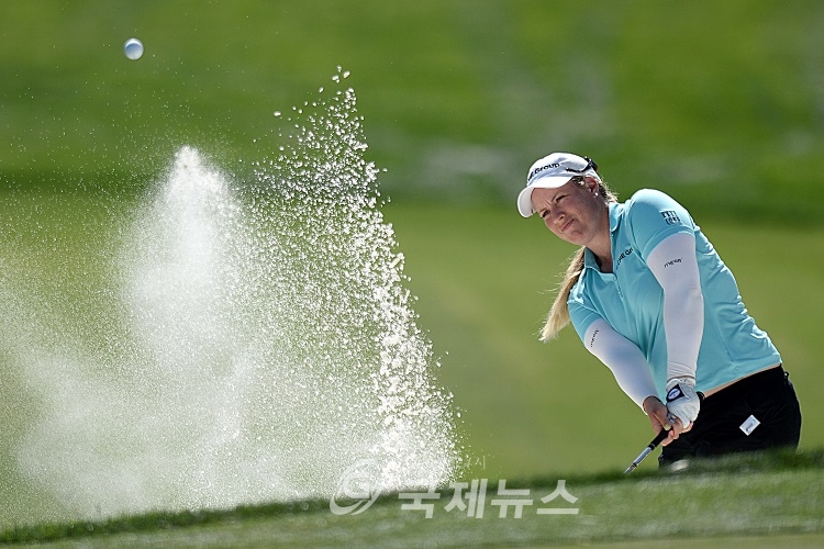 Apr 5, 2015; Rancho Mirage, CA, USA; Brittany Lincicome plays out of a bunker on the eighth hole during the final round of the ANA Inspiration at Mission Hills CC - Dinah Shore Tournament Course. Mandatory Credit: Jake Roth-USA TODAY Sports