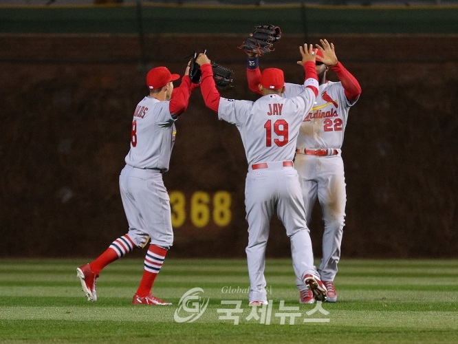 Apr 5, 2015; Chicago, IL, USA; St. Louis Cardinals left fielder Peter Bourjos (left ) and center fielder Jon Jay (center) and right fielder Jason Heyward (right) celebrate their victory following the ninth inning against the Chicago Cubs at Wrigley Field. St. Louis won 3-0. Mandatory Credit: Dennis Wierzbicki-USA TODAY Sports