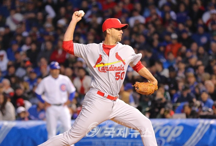 Apr 5, 2015; Chicago, IL, USA; St. Louis Cardinals starting pitcher Adam Wainwright (50) delivers a pitch during the first inning against the Chicago Cubs at Wrigley Field. Mandatory Credit: Dennis Wierzbicki-USA TODAY Sports