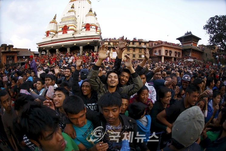 Devotees reach out their hands to grab the offerings thrown by the priest (unseen) during religious rituals of Rato Machhindranath at Bungamati in Lalitpur April 5, 2015. Rato Machhindranath is known as the god of rain and both Hindus and Buddhists worship Machhindranath for good rain to prevent drought during the rice harvest season. REUTERS/Navesh Chitrakar