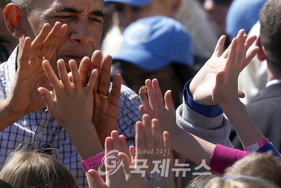 U.S. President Barack Obama high-fives with children after reading the storybook "Where the Wild Things Are" during the annual Easter Egg Roll at the White House in Washington April 6, 2015. REUTERS/Jonathan Ernst