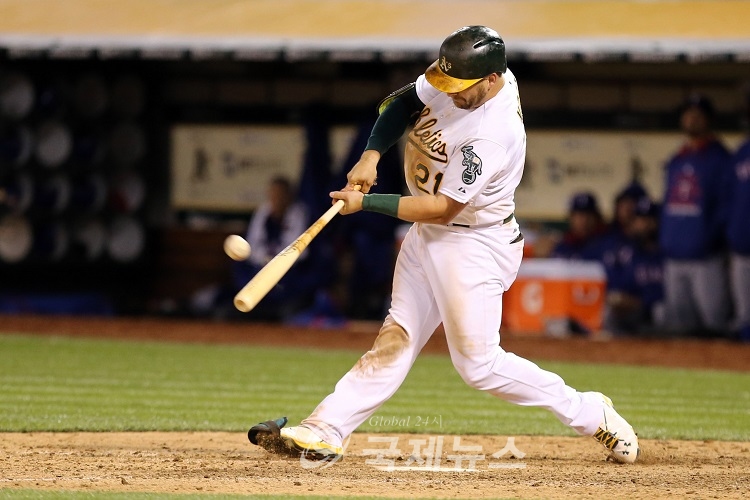 Apr 6, 2015; Oakland, CA, USA; Oakland Athletics catcher Stephen Vogt (21) hits a three run home run against the Texas Rangers during the seventh inning at O.co Coliseum. Mandatory Credit: Kelley L Cox-USA TODAY Sports