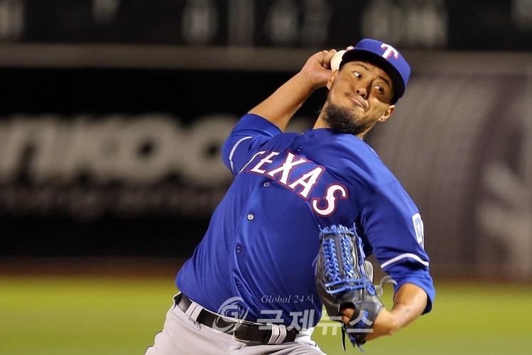 Apr 6, 2015; Oakland, CA, USA; Texas Rangers starting pitcher Yovani Gallardo (49) pitches the ball against the Oakland Athletics during the third inning at O.co Coliseum. Mandatory Credit: Kelley L Cox-USA TODAY Sports