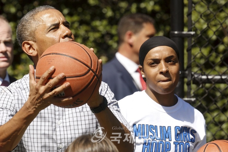 U.S. President Barack Obama plays basketball with Bilqis Abdul-Qaadir (R) as he takes a tour of the exercise activities at the annual Easter Egg Roll at the White House in Washington April 6, 2015. REUTERS/Jonathan Ernst