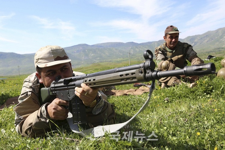 A member of Kurdish peshmerga forces holds a rifle during a training session at a training camp on the outskirts of Dohuk province April 7, 2015. The coalition forces were training the Kurdish peshmerga soldiers on fighting in street battles. REUTERS/Ari Jalal
