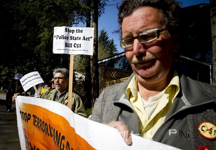Protesters demonstrate against government policies outside a secondary school where Canada's Prime Minister Stephen Harper is visiting in North Vancouver, British Columbia April 7, 2015. REUTERS/Ben Nelms
