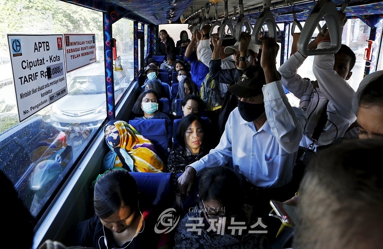 Passengers sleep as others stand on a public bus while travelling to work during a traffic jam in Jakarta, April 8, 2015. REUTERS/Beawiharta