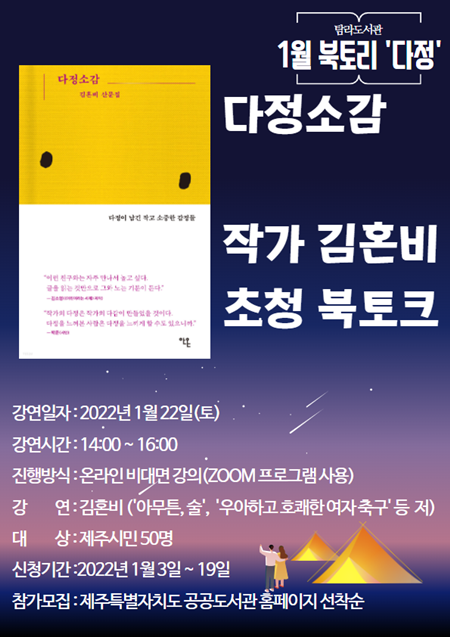 (제주=국제뉴스) 문서현 기자 = 제주시 탐라도서관은 오는 22일 오후2시 김혼비 작가를 초정해 김 작의 신작인 '다정소감' 온라인 북토크를 연다.