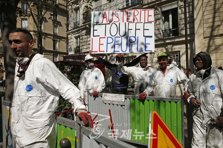 A man holds a placard which reads "Austerity suffocates the people" next to workers during a demonstration against austerity plans which affect salaries and pensions in Paris, April 9, 2015. French unions sought on Thursday to ramp up protests against public spending cuts, calling for work stoppages and marches by public-sector staff that coincided with strikes by air traffic controllers and state radio workers. REUTERS/Benoit Tessier