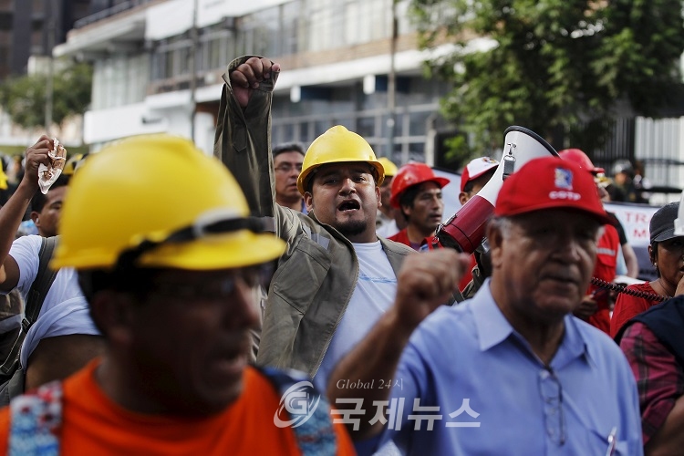 Protesters shout slogans during a demonstration against the government and the Peruvian National Federation of Private Business Institutions in Lima April 8, 2015. Thousands of people from unions marched through Lima's main avenues to demand the repeal of laws which they believe cut their labor rights and promote collective dismissals, local media reported. REUTERS/Enrique Castro-Mendivil
