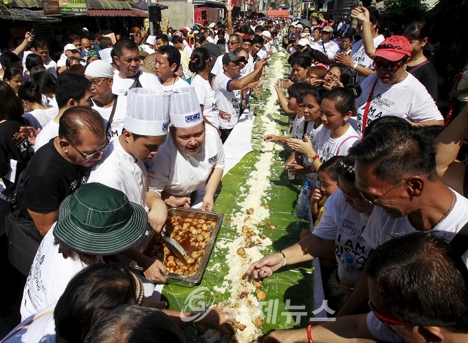 Students from the Center for Culinary Art Manila serve hundreds of Balut, a local delicacy of boiled duck embryo, on banana leaves in preparation for the boodle feast during an attempt to make a Guinness World Record in the Pateros municipality, metro Manila April 10, 2015. Participants try to make a Guinness World Record for Largest Edible Serving of Balut attaining a record of 117.5 kilograms of Balut in which the event aims to promote the local delicacy rather than a dare-food for foreign tourist, organizer said. REUTERS/Romeo Ranoco