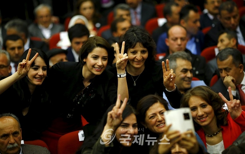 Female candidates of pro-Kurdish Peoples' Democracy Party (HDP) pose for a selfie during a meeting, beginning their party's campaign for Turkey's June 7 parliamentary elections in Ankara April 10, 2015. REUTERS/Umit Bektas