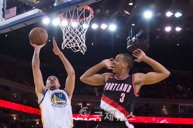 April 9, 2015; Oakland, CA, USA; Golden State Warriors guard Klay Thompson (11) shoots the basketball against Portland Trail Blazers guard C.J. McCollum (3) during the fourth quarter at Oracle Arena. The Warriors defeated the Trail Blazers 116-105. Mandatory Credit: Kyle Terada-USA TODAY Sports