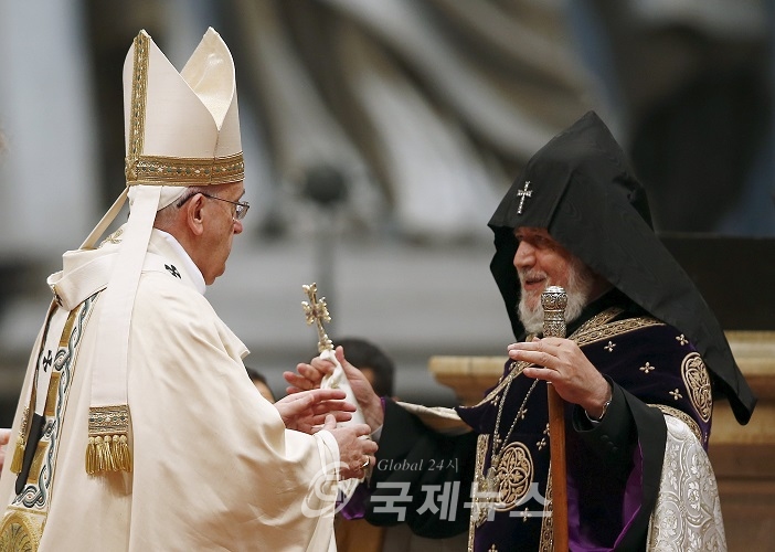 Pope Francis (L) embraces Catholicos of All Armenians Karekin II during a mass on the 100th anniversary of the Armenian mass killings, in St. Peter's Basilica at the Vatican April 12, 2015. Pope Francis on Sunday commemorated the 100th anniversary of the massacre of as many as 1.5 million Armenians as "the first genocide of the 20th century," words that could draw an angry reaction from Turkey. REUTERS/Tony Gentile