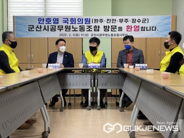(군산=국제뉴스) 조판철 기자 = 군산시공무원노동조합(위원장 송철)은 지난 5일 군산시 공무원 노조사무실에서 국회 환경노동위원회 안호영 국회의원(완주,무주,진안,장수군)과 강임준 시장이 참석한 가운데, 공무원 노동정책과 군산시 현안에 대한