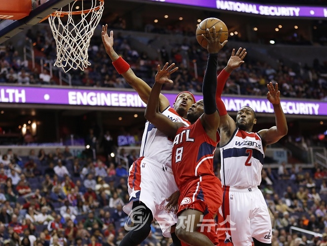 Apr 12, 2015; Washington, DC, USA; Washington Wizards guard John Wall (2) blocks the shot of Atlanta Hawks guard Shelvin Mack (8) in the second quarter at Verizon Center. The Wizards won 108-99. Mandatory Credit: Geoff Burke-USA TODAY Sports
