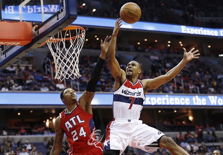 Apr 12, 2015; Washington, DC, USA; Washington Wizards guard Ramon Sessions (7) is fouled while shooting the ball by Atlanta Hawks guard Kent Bazemore (24) in the fourth quarter at Verizon Center. The Wizards won 108-99. Mandatory Credit: Geoff Burke-USA TODAY Sports
