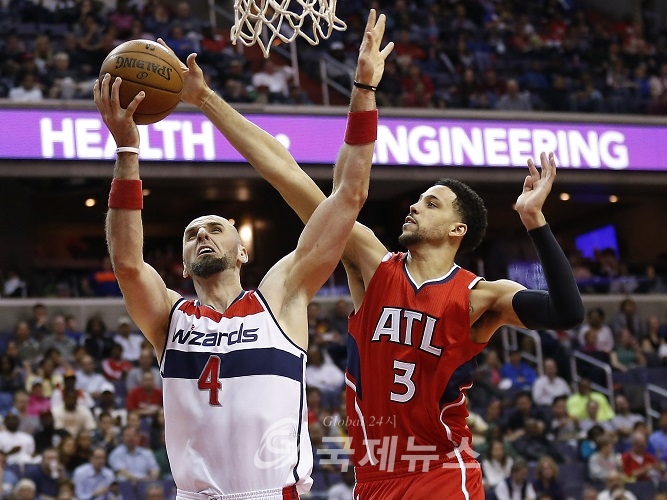 Apr 12, 2015; Washington, DC, USA; Washington Wizards center Marcin Gortat (4) shoots the ball as Atlanta Hawks forward Austin Daye (3) defends in the fourth quarter at Verizon Center. The Wizards won 108-99. Mandatory Credit: Geoff Burke-USA TODAY Sports
