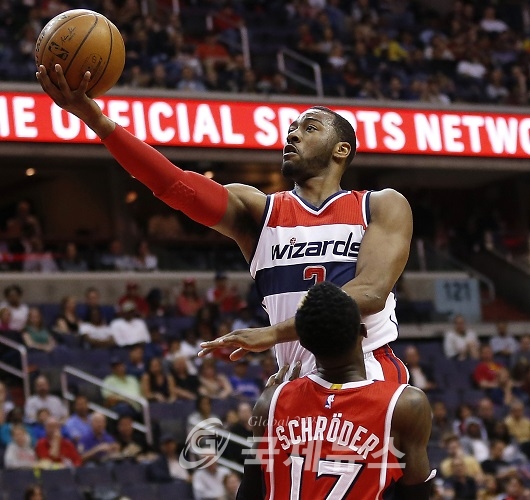 Apr 12, 2015; Washington, DC, USA; Washington Wizards guard John Wall (2) shoots the ball over Atlanta Hawks guard Dennis Schroder (17) in the third quarter at Verizon Center. The Wizards won 108-99. Mandatory Credit: Geoff Burke-USA TODAY Sports