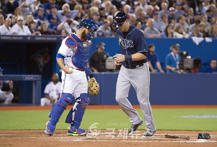 Apr 13, 2015; Toronto, Ontario, CAN; Tampa Bay Rays first baseman Allan Dykstra (31) scores during the fourth inning in the Toronto Blue Jays home opener at Rogers Centre. Mandatory Credit: Nick Turchiaro-USA TODAY Sports