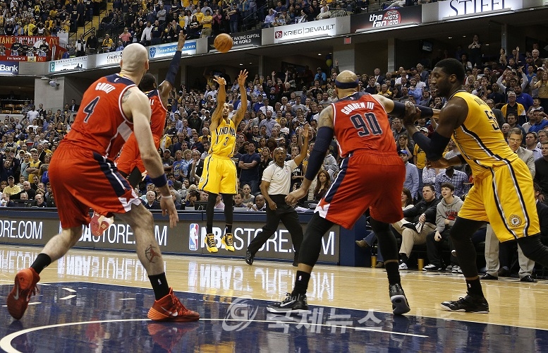 Apr 14, 2015; Indianapolis, IN, USA; Indiana Pacers guard George Hill (3) makes a game winning three pointer in double overtime against Washington Wizards guard Bradley Beal (3) at Bankers Life Fieldhouse. Indiana defeats Washington 99-95 in double overtime. Mandatory Credit: Brian Spurlock-USA TODAY Sports