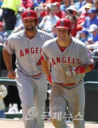 Apr 15, 2015; Arlington, TX, USA; Los Angeles Angels center fielder Mike Trout (R) and designated hitter Albert Pujols (L) head to the dug out after scoring runs on a hit by left fielder Matt Joyce (not pictured) in the second inning against the Texas Rangers at Globe Life Park in Arlington. Mandatory Credit: Tim Heitman-USA TODAY Sports