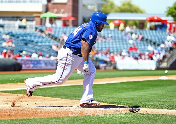 Mar 24, 2015; Surprise, AZ, USA; Texas Rangers first baseman Prince Fielder bunts for an infield single in the second inning against the Los Angeles Angels in a spring training game at Surprise Stadium. Mandatory Credit: Mark J. Rebilas-USA TODAY Sports